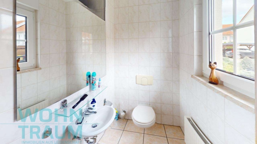 Die Ausstattung ist als normal zu bezeichnen und umfasst unter anderem Teppichboden und Fliesen als Bodenbelag. Außerdem gibt es einen Außenstellplatz und eine Garage, die für ausreichend Parkmöglichkeiten sorgen. Ein praktischer Abstellraum sowie ein Gäste-WC runden das Angebot ab.